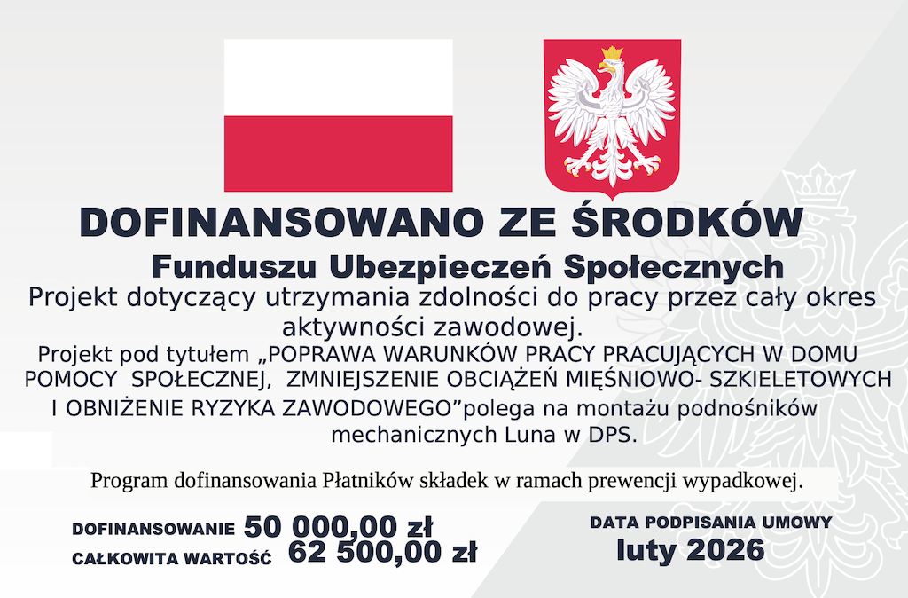 Nasz Dom bierze udział w Projekcie dofinansowanym ze środków Zakładu Ubezpieczeń Społecznych pod tytułem „Poprawa warunków pracy pracujących w Domu Pomocy Społecznej zmniejszenie obciążeń mięśniowo-szkieletowych i obniżenie ryzyka zawodowego”. Program dofinansowania Płatników składek w ramach prewencji wypadkowej. Projekt dotyczący utrzymania zdolności do pracy przez cały okres aktywności zawodowej. W ramach Projektu w DPS zamontowane zostaną mechaniczne podnośniki LUNA co ma na celu zredukowanie obciążeń układu – ruchu opiekunów pracujących w DPS.